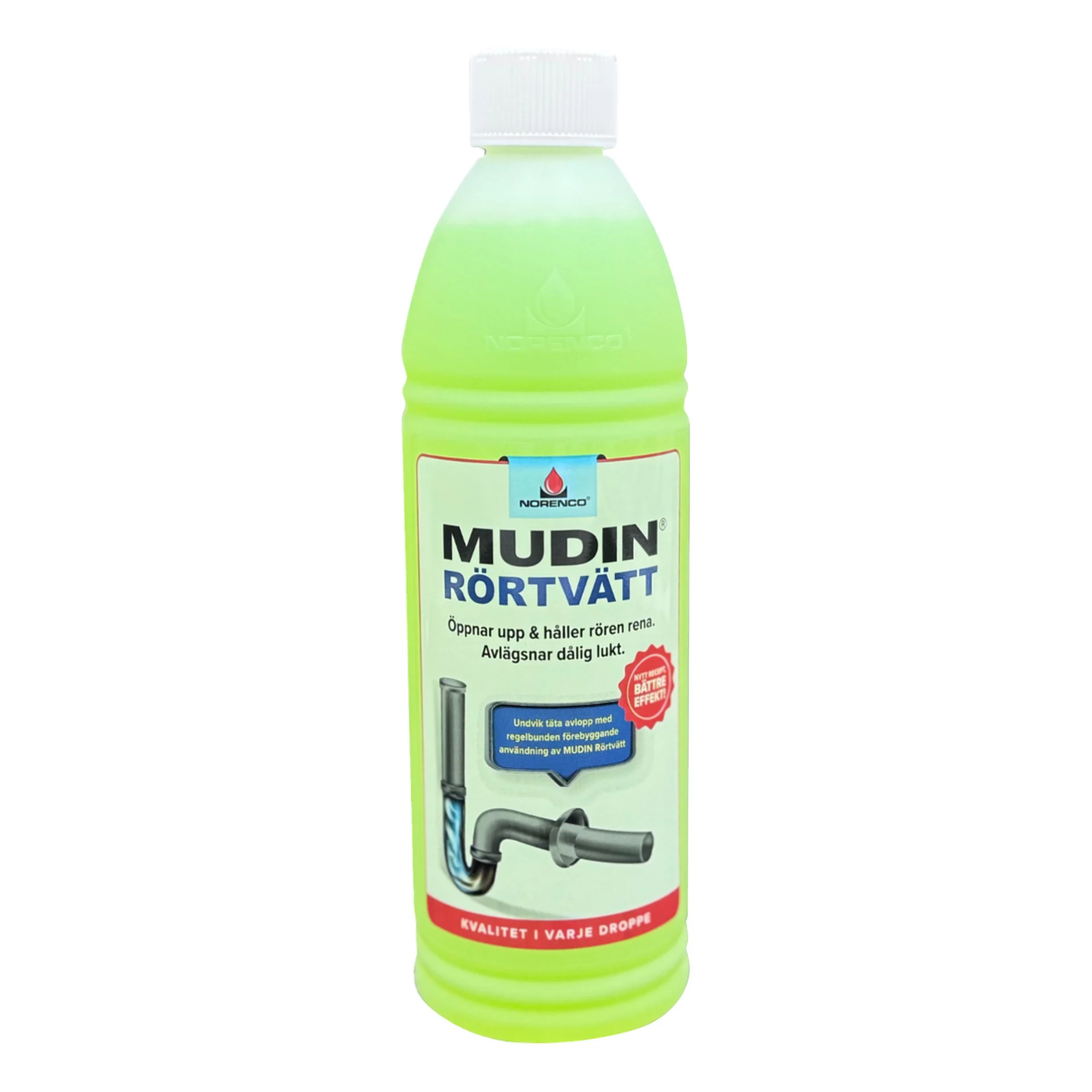 MUDIN Rörtvätt öppnar upp och avlägsnar fett, slam, hår, tvålrester, tandkräm och dålig lukt.